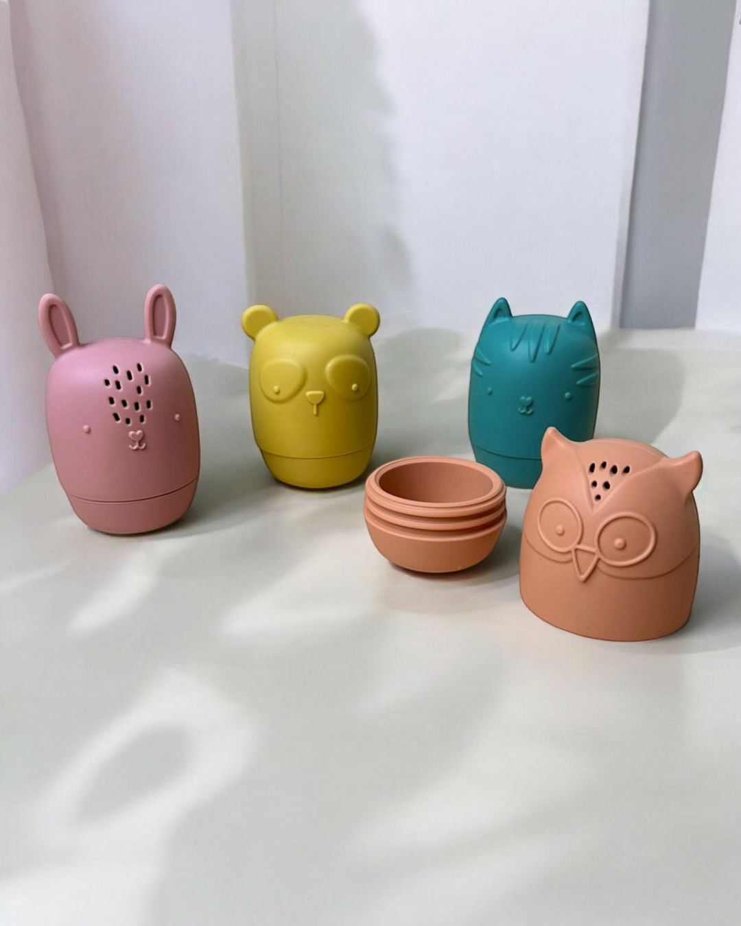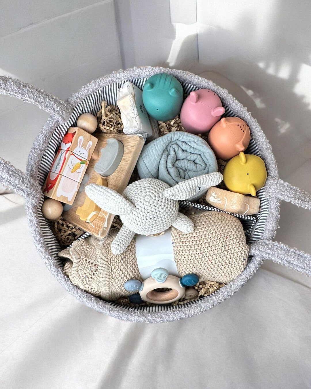 This tiny treasures caddy includes a bed, play, and bath time selection of items:
