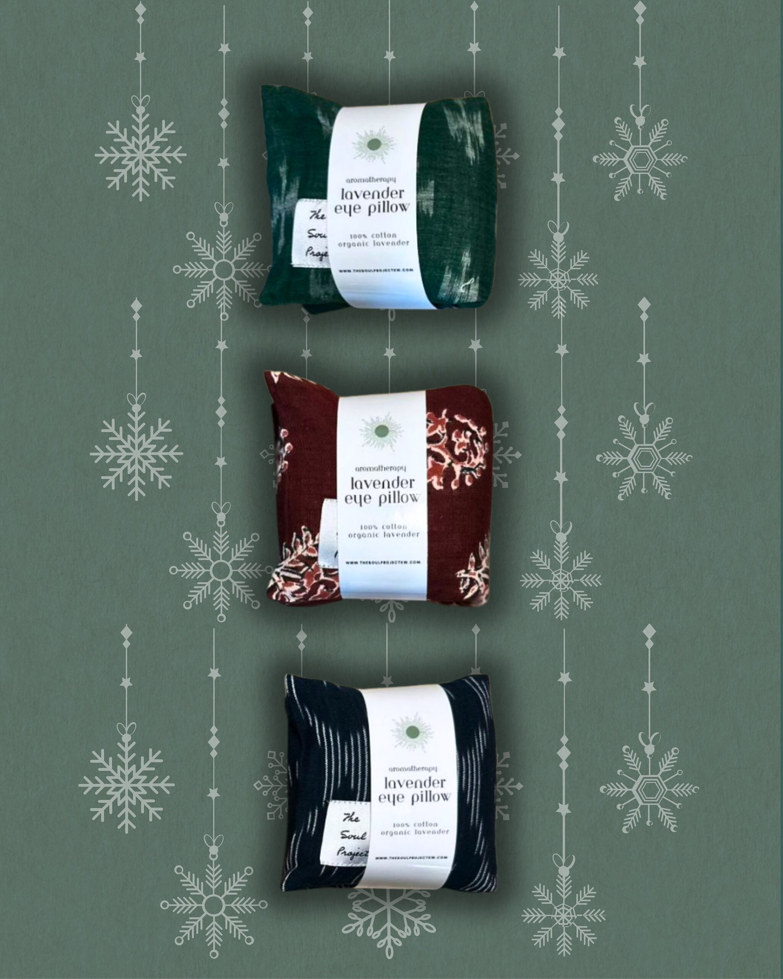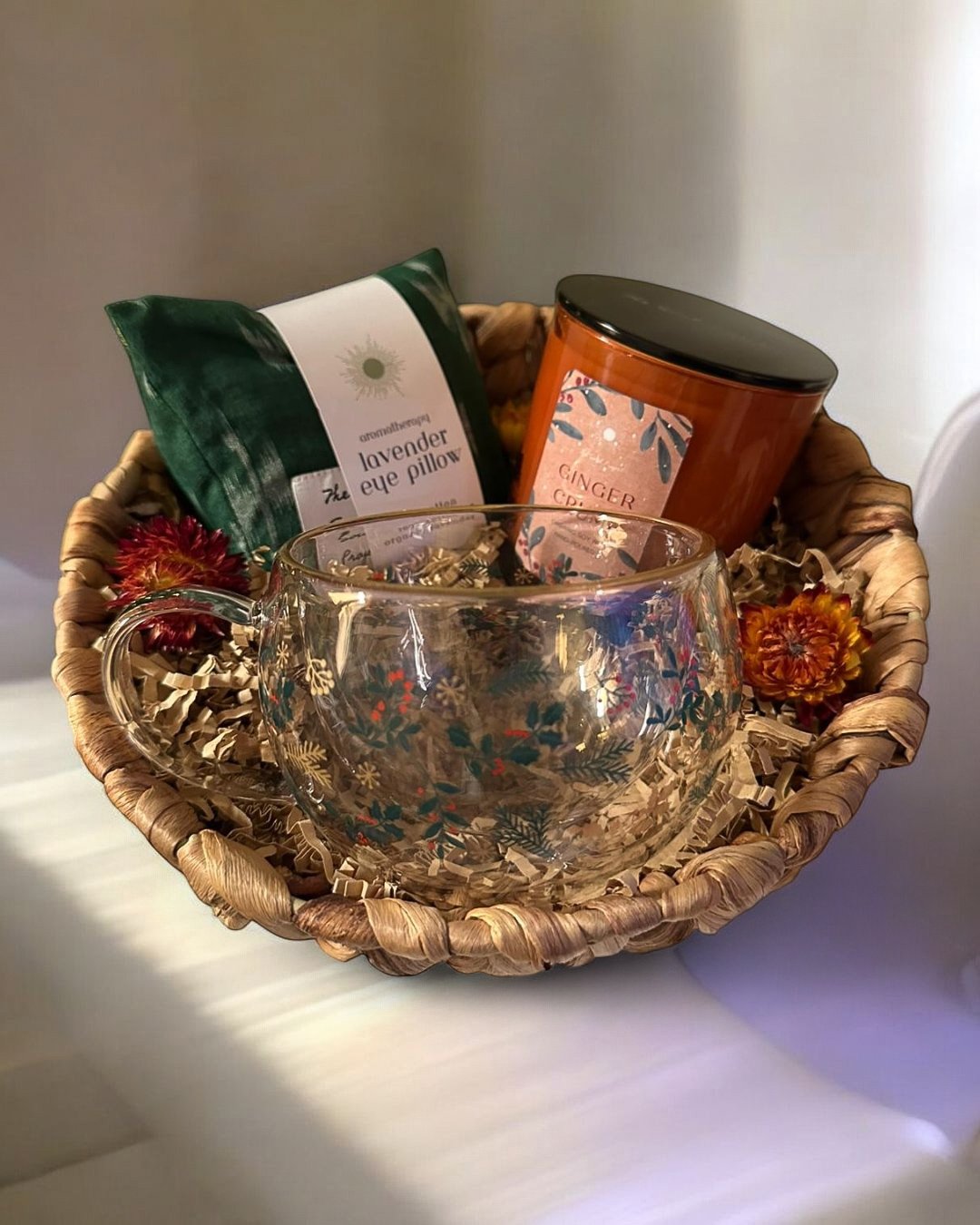 This self care basket includes: Aromatherapy lavender eye pillow Organic soy wax candle Winter mug